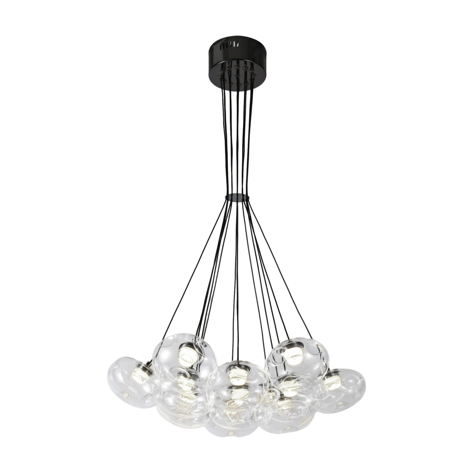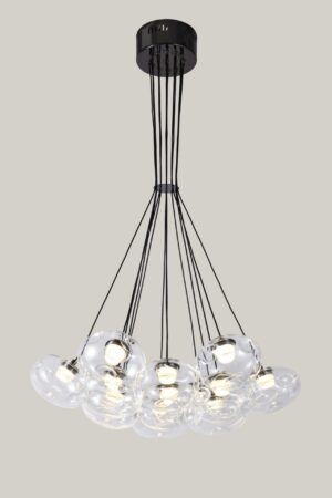 Create a bold statement with the 13-Light Clear Glass Ball Black Cluster Chandelier. Designed for modern interiors, this chandelier features a cluster of beautifully crafted organic glass balls suspended from a sleek black frame. It’s an eye-catching piece that instantly adds sophistication and charm to your space.