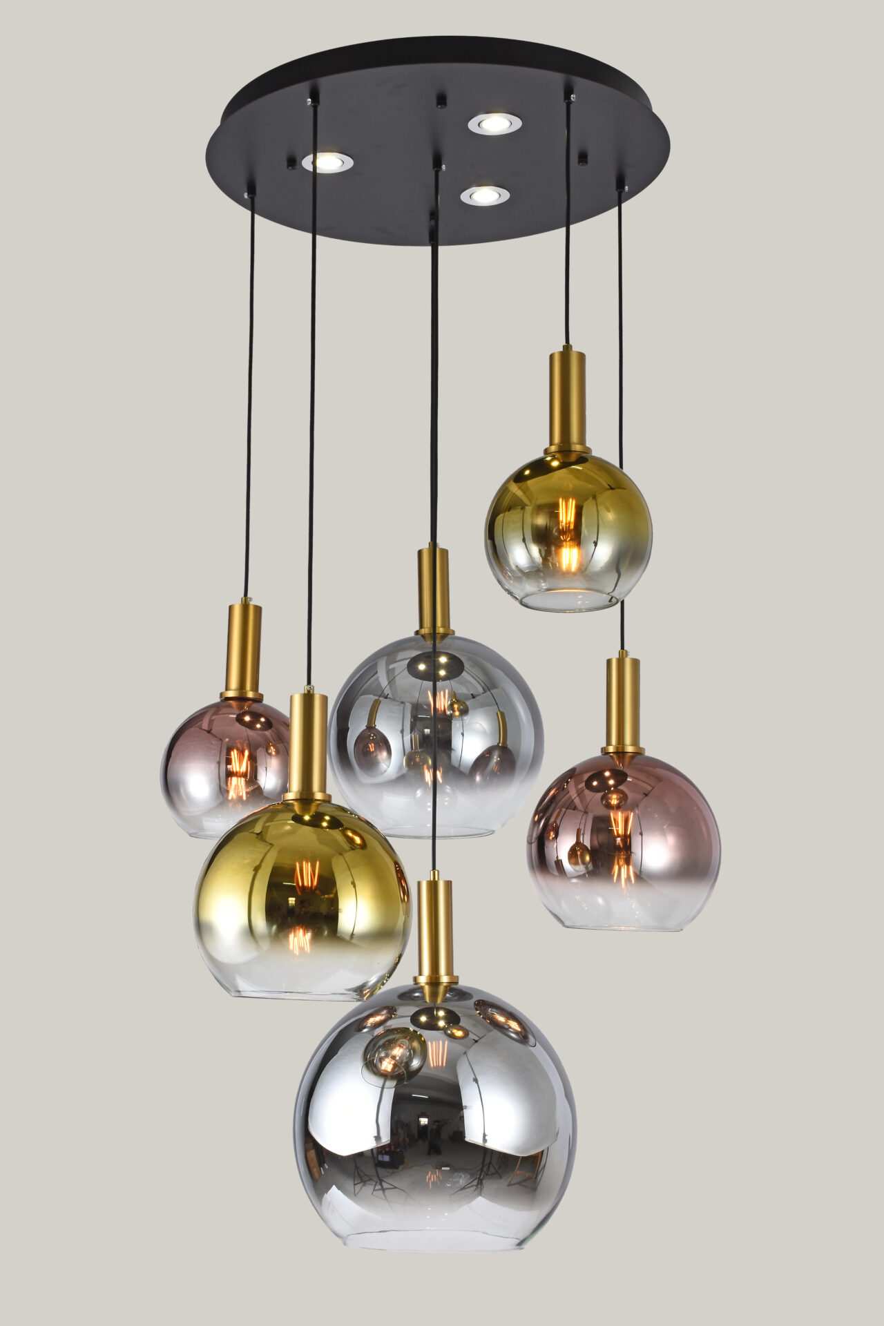 Crafted from premium materials, it features a sleek black ceiling plate with brass gold holders and five stunning glass shades in rich, multi-coloured hues that reflect and diffuse light beautifully. Ideal for contemporary homes, restaurants, lofts, or showrooms seeking a distinctive centrepiece.