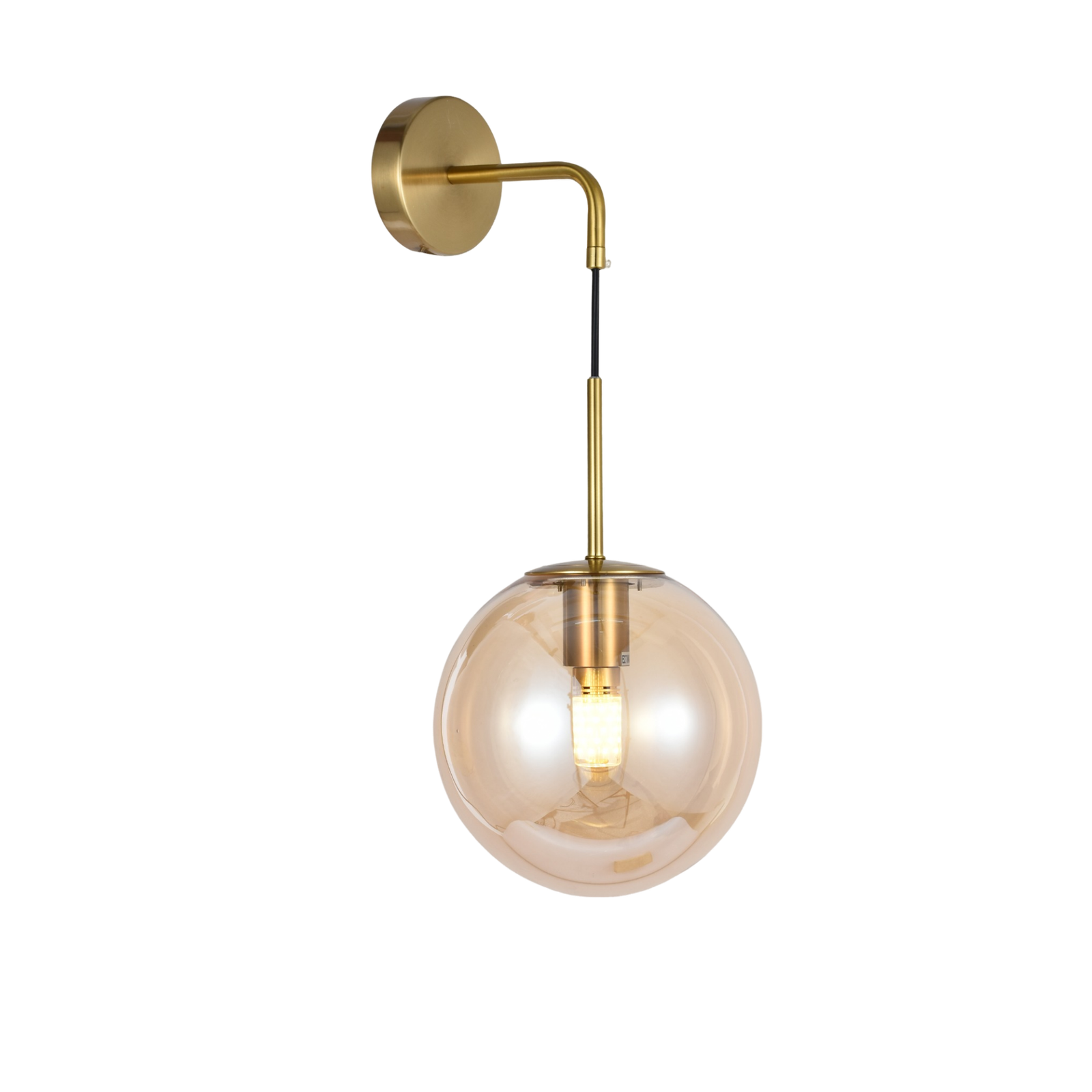 Crafted from high-quality iron with a brass gold finish, the pendant features an amber glass shade with intricate perforations inspired by filament designs, casting beautiful ambient light patterns. This energy-saving wall light is ideal for enhancing spaces such as dining rooms, hallways, or restaurants.