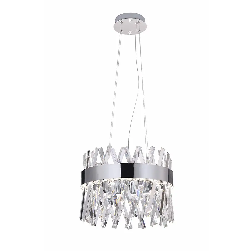 The Crystal Chrome Pendant Chandelier features a sleek, contemporary design with a luxurious silver finish. Its sparkling crystal details make it a stunning centerpiece that easily enhances any room. Not only does it add a touch of elegance, but it also creates a comfortable and relaxing atmosphere in your home or project.
