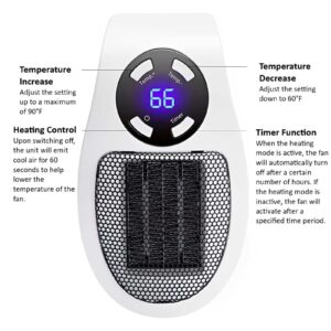 Features: Plastic Heating Body: The Electric Plug In Mini Wall heater utilizes a PTC ceramic heating element, ensuring safe operation with no open flames, low working temperature, self-control constant temperature function, and extended service life. It operates quietly and efficiently, saving energy while providing warmth. Built-in Constant Temperature Control System: Equipped with a built-in system, the heater enters sleep mode automatically once the room temperature reaches the set level. It resumes operation when the temperature drops below the desired level, preventing overheating and promoting energy efficiency. Intelligent Temperature Control: The heater employs a double protection temperature control system along with overheat protection, ensuring your safety during use. Low Noise and No Light: Designed for peaceful sleep, the heater operates silently without emitting light, making it suitable for any time of day or night. Its gentle warmth does not cause eye strain, allowing children and the elderly to use it worry-free. LED Temperature Display: The integrated temperature display provides an accurate reading of the indoor temperature, allowing you to monitor and adjust it according to your comfort. Metal Grid Design: The heater features a high-temperature resistant fine grid design, promoting faster and safer heat dissipation. Fan Blade Air Flow Design: With its specially designed fan blades, the heater generates a larger volume of warm air, facilitating quicker air convection and enhanced heat conversion. Specifications: