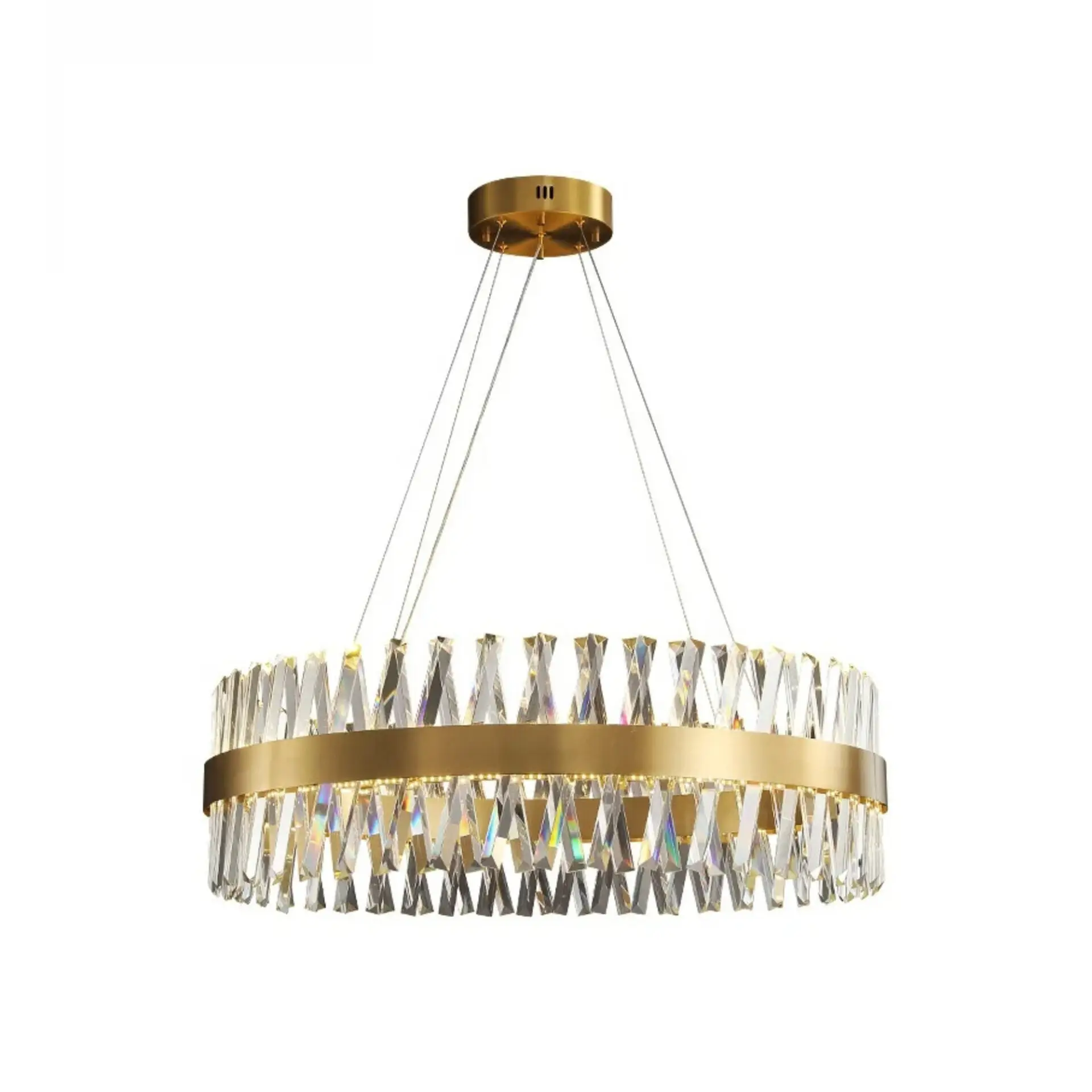 Crafted with meticulous attention to detail, the chandelier features a stunning array of cascading crystals that beautifully refract light, creating a dazzling display that captivates the eye. The high-quality gold finish adds a regal touch, complementing both classic and contemporary interior styles.