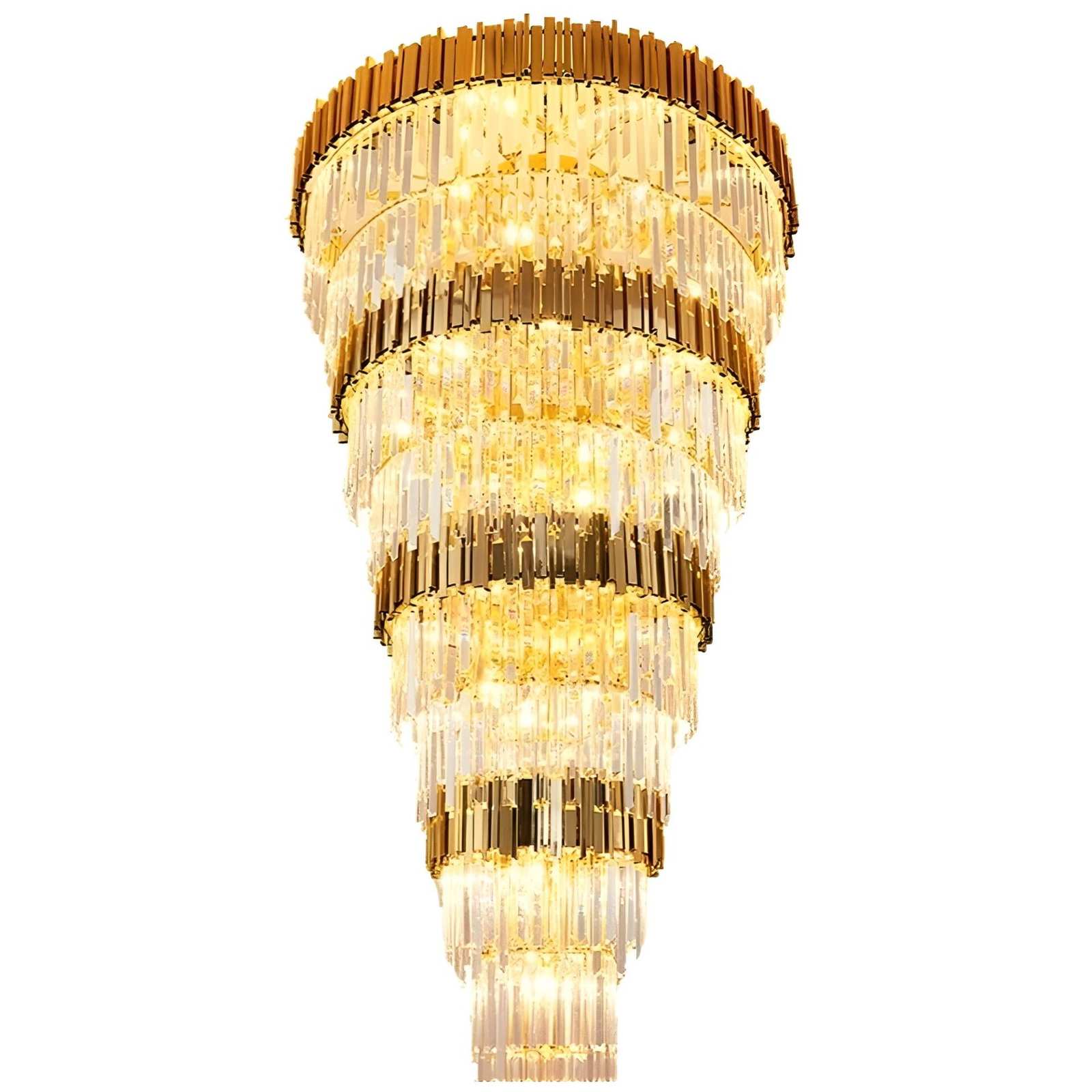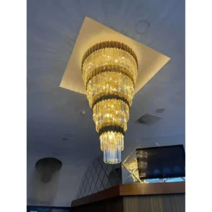 The High Ceiling Gold Crystal Chandelier stands out as a stunning centerpiece for rooms with tall ceilings. Its modern shape and rich gold finish bring a sense of luxury to any space, whether at home or in a business. Sparkling crystal details add extra shine and make a lasting impression on everyone who enters the room.