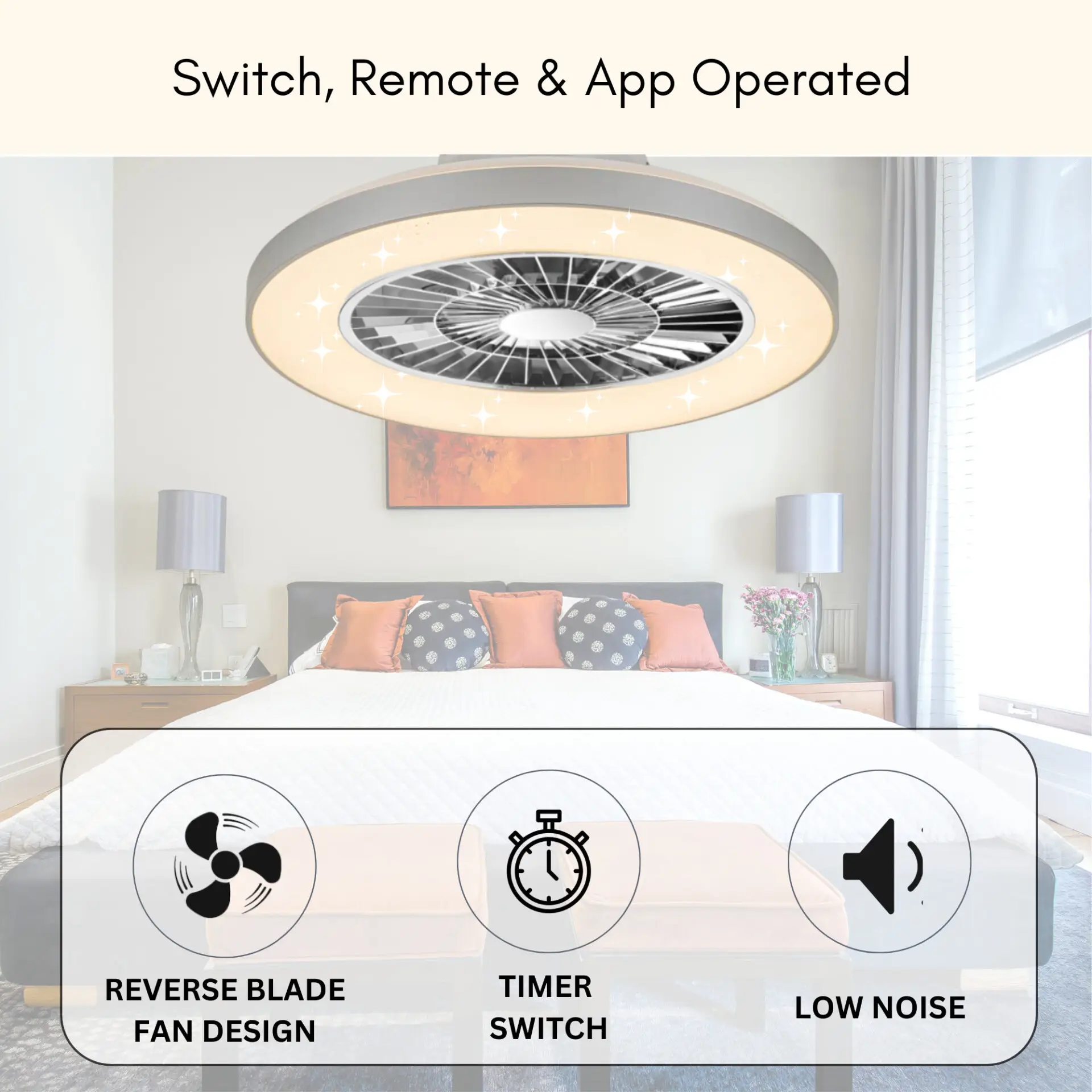 Smart Control: Operate the fan and light effortlessly using the included remote control or via a mobile app for ultimate convenience.
