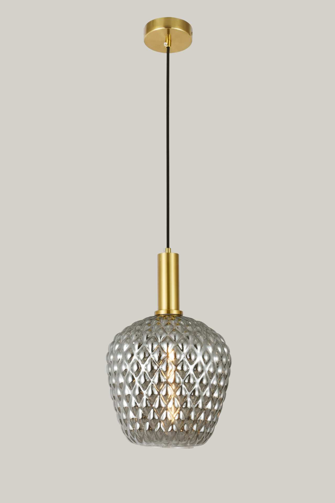 Elevate your interior with the Textured Smoke Glass Shade Brass Gold Pendant Light — a stylish fusion of modern elegance and industrial charm. Designed to captivate, this pendant light makes a bold design statement with its sculptural form and moody smoke glass finish.